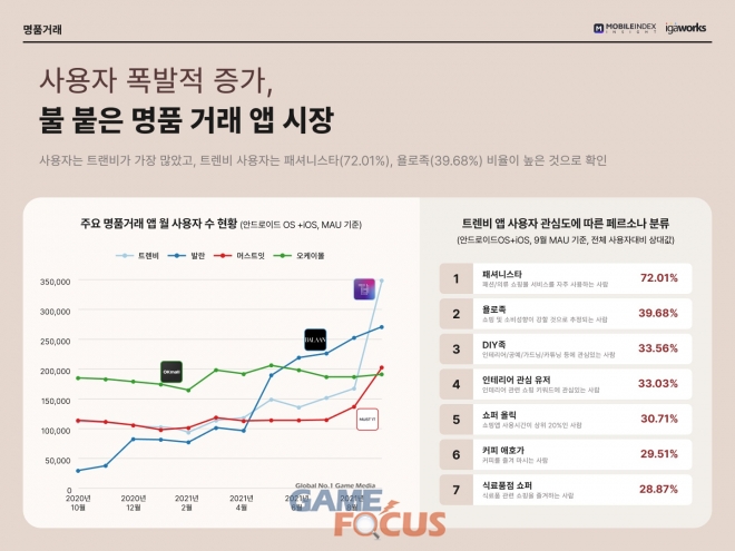 명품 거래 앱 사용자도 큰 폭으로 늘어났다. ‘트렌비’의 9월 사용자수는 올해 1월(10만 2130명) 대비 3.4배인 34만 8229명으로 나타났다. ‘트렌비’의 사용자 페르소나 분석 결과, ‘패셔니스타’(72.01%) 비율이 가장 높았고, ‘욜로족(39.68%)’이 그 뒤를 이었다.
