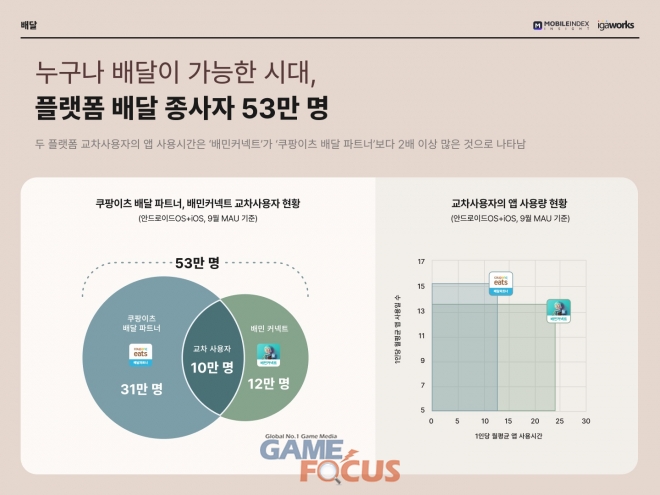 ‘쿠팡이츠 배달 파트너’, ‘배민커넥트’ 앱 합산 사용자수(중복제거)는 53만명에 달하는 것으로 나타났다. 두 플랫폼 교차사용자의 앱 사용시간은 ‘배민커넥트’가 ‘쿠팡이츠 배달 파트너’ 보다 2배 이상 많았다.