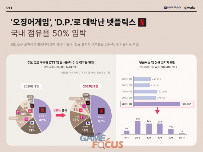 ‘오징어게임’, ‘D.P’ 등 오리지널 콘텐츠 흥행에 힘입어, 9월 신규설치자 수 119만 6987명을 기록한 ‘넷플릭스’는 국내 주요 유료 구독형 OTT 앱 사용자수 점유율 47%를 돌파했다. ‘넷플릭스’ 9월 사용자수는(MAU) 1229만 2492명으로, 전년동기(803만 5926명) 대비 52%가량 증가한 수치다.