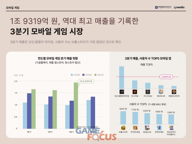 한편, 2021년 3분기, 모바일 게임 시장 매출은 1조 9319억원으로 역대 최고 기록을 경신했다. 같은 기간, 매출 1위 게임은 2000억원이 넘는 매출을 기록한 ‘오딘: 발할라 라이징’으로 확인됐으며, 7월부터 9월까지 월평균 사용자수가 가장 많은 게임 앱은 ‘브롤스타즈’였다.