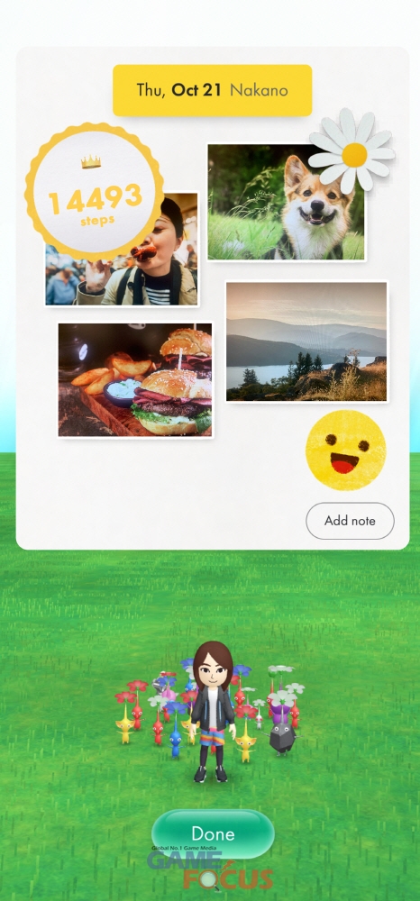 매일 날이 저물 때면 하루 동안 걸어온 길과 걸음 수를 되돌아볼 수 있다. 하루 되돌아보기에 노트와 사진을 더해 평범했던 하루를 특별한 추억으로 만들 수도 있다. '피크민'은 방문한 장소에서 엽서를 가져올 수도 있고, 이 엽서는 저장하거나 앱에서 친구에게 보낼 수도 있다.