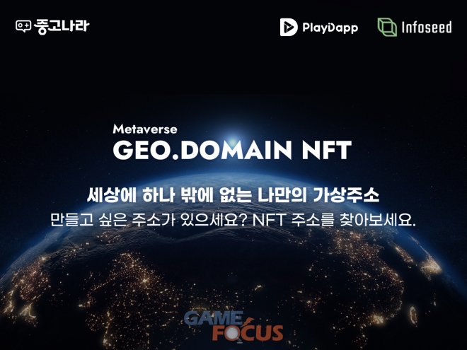 메타버스 가상지구 NFT 분양권은 국내 1위 중고거래 플랫폼 중고나라와 주소 혁신 전문 기업 인포씨드, 그리고 블록체인 기술 기업 플레이댑의 합작 프로젝트이다.