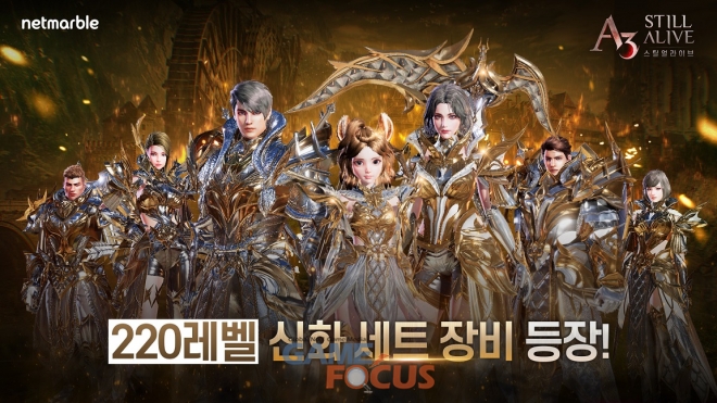 넷마블(대표 권영식, 이승원)은 모바일 최초 배틀로얄 MMORPG(다중접속역할수행게임) ‘A3: 스틸얼라이브’에 220레벨 신화 세트 장비를 추가하는 등 업데이트를 실시했다고 8일 밝혔다.
