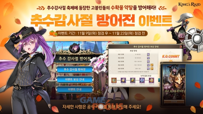 추수 감사절을 맞이해 열리는 '킹스레이드' 이벤트 던전과 다양한 이벤트에 대한 자세한 내용은 공식 카페 및 브랜드 페이지)를 통해 확인할 수 있다.