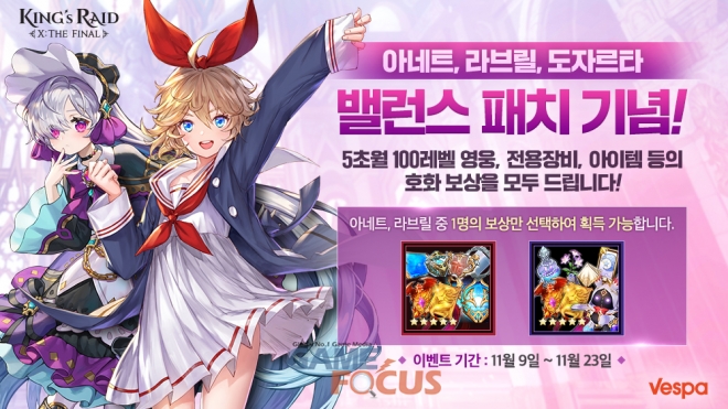 이 밖에도 '아네트'와 '라브릴', '도자르타'의 영웅 밸런스를 조정하는 업데이트를 진행했으며, 이를 기념해 매일 게임에 접속만 해도 풍성한 아이템을 지급하는 밸런스 패치 기념 출석 이벤트를 실시한다.