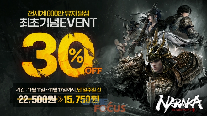 넷이즈의 자회사인 24 Entertainment가 개발하고, 넷이즈가 퍼블리싱 중인 배틀로얄 액션 '나라카: 블레이드포인트’에 새로운 영웅 '악산’을 새시즌(11월 11일 '전장의 파괴자')에 출시함과 동시에 전 세계 판매량 600만 기념으로 11월 11일부터 11월 17일까지 스팀 내의 게임 가격을 30% 할인하며 공식 홈페이지에서 구매 시 40%까지 파격적인 할인 이벤트를 진행한다.