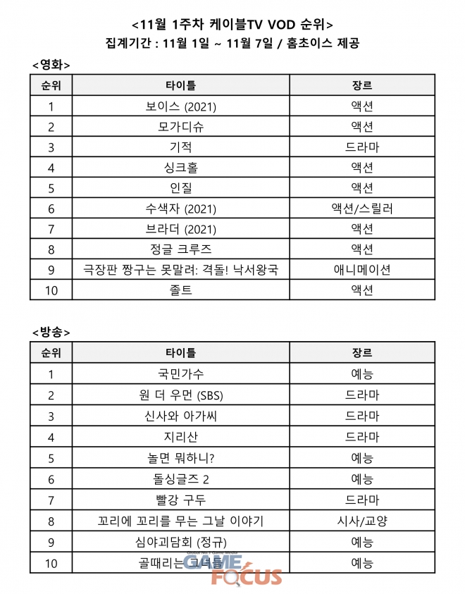 11일 (주)홈초이스가 발표한 LG헬로비전, Btv 케이블, 딜라이브, CMB, 현대HCN 등 전국 케이블TV '11월 1주차 영화 · 방송 VOD 순위'에 따르면, '보이스'가 영화 VOD 판매 순위 1위를 새롭게 차지했다.
