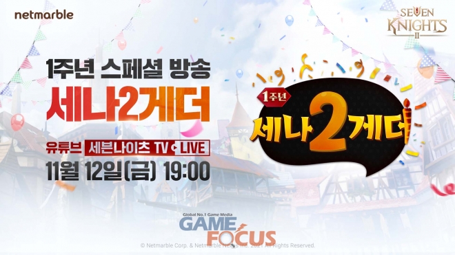 넷마블(대표 권영식, 이승원)이 모바일 MMORPG '세븐나이츠2'(개발사 넷마블넥서스) 서비스 1주년을 기념한 스페셜 생방송 '세나2게더'를 11월 12일 오후 7시 유튜브 채널 '세븐나이츠TV'에서 진행한다.