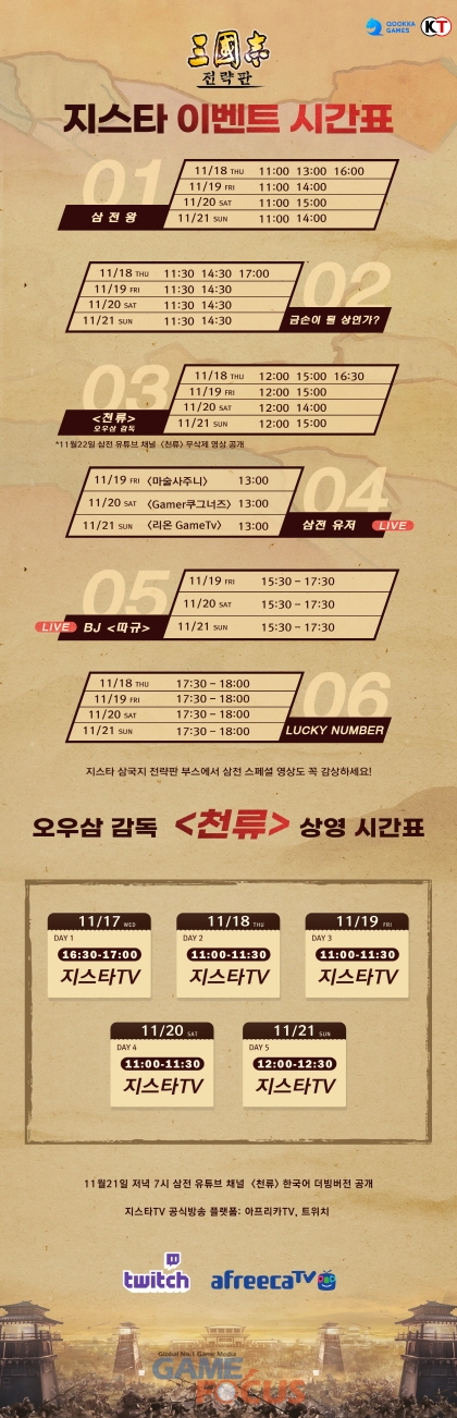 특히, 19일부터 21일까지 오후 3시 30분부터는 '삼국지 전략판'의 실제 맹주로 유명세를 치른 BJ 전태규(따규)를 초청하여, 다양한 게임 노하우를 현장 참관객들에게 전파할 예정이다.