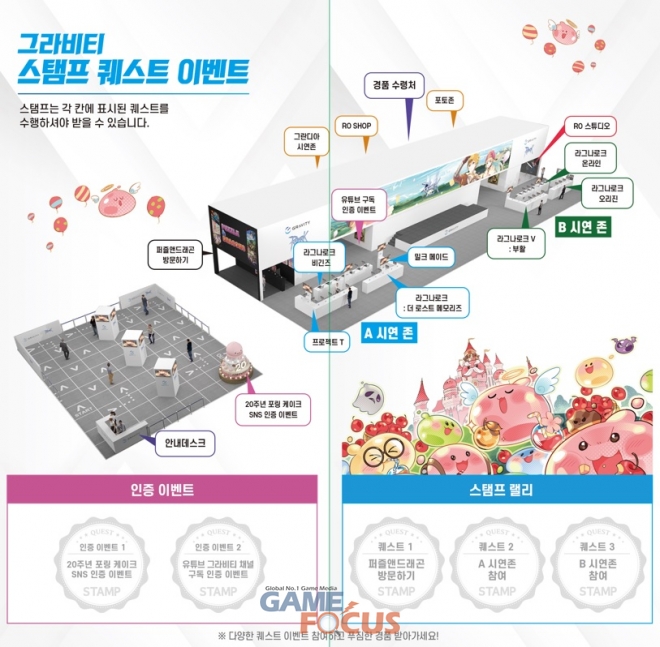 이와 함께 그라비티는 인포데스크에서 받은 미션지에 타이틀 시연, 그라비티 공식 유튜브 채널 구독, 20주년 포링 조형물 SNS 인증 등을 진행한 후 도장을 채우면 경품을 주는 ‘RO 스탬프 랠리’, ‘SNS 인증 이벤트’ 등 현장 이벤트를 진행한다. 카프라 모델의 ‘댄스 퍼포먼스와 포토타임’ 등 다채로운 볼거리도 준비되어 있다.