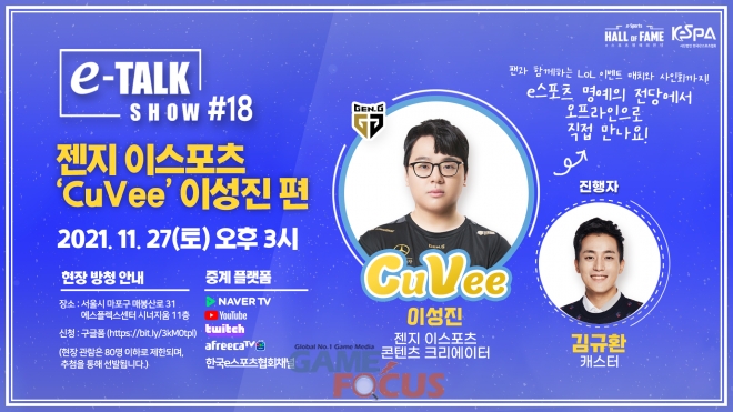 한국e스포츠협회는 오는 27일(토) 오후 3시 e스포츠 명예의 전당(서울 마포)에서 '큐베' 이성진이 출연하는 e-토크쇼 #18을 진행한다.