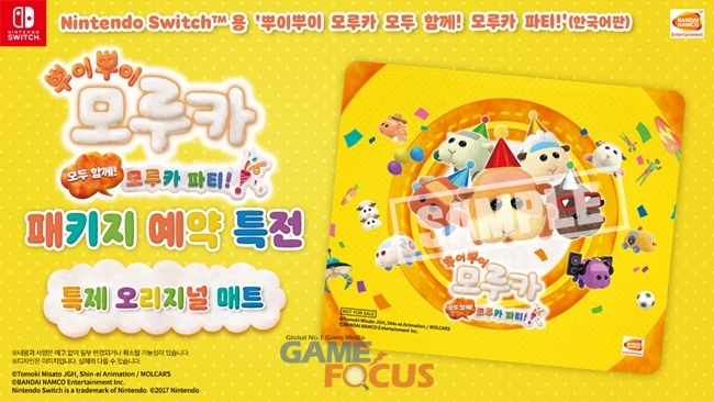 Nintendo Switch용 '뿌이뿌이 모루카 모두 함께! 모루카 파티!'(한국어판)의 패키지 버전 예약 판매가 12월 2일부터 시작된다. 패키지 버전의 예약 특전으로는 귀여운 모루카의 비주얼이 삽입된 '특제 오리지널 매트'를 증정한다.