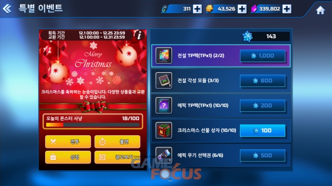 먼저 12월 1일부터 크리스마스 당일인 12월 25일까지 다양한 인게임 아이템 획득 기회를 제공하는 '크리스마스 눈송이 이벤트'를 실시한다. 이벤트 기간 동안 일반 모드에서 몬스터를 처치하거나 광고 시청, 룰렛, 상품 구매 등을 통해 '눈송이' 아이템을 수집할 수 있으며, 이벤트 페이지에서 전설TP팩이나 에픽TP팩, 각성 모듈, 크리스마스 선물 상자 등 다양한 아이템으로 교환 가능하다.