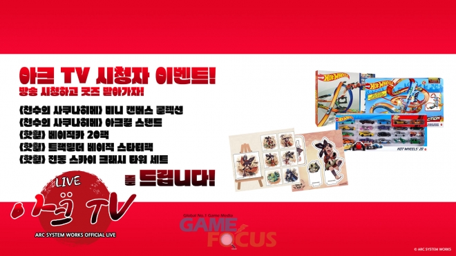 '아크TV 생방송'은 2021년 12월 3일 (금) 오후 7시부터 트위치 ‘아크시스템웍스아시아' 채널을 통해 시청할 수 있으며, 방송 중 추첨을 통해 '천수의 사쿠나히메' 및 '핫휠 언리쉬드' 굿즈를 경품으로 증정하는 시청자 이벤트도 진행될 예정이다.