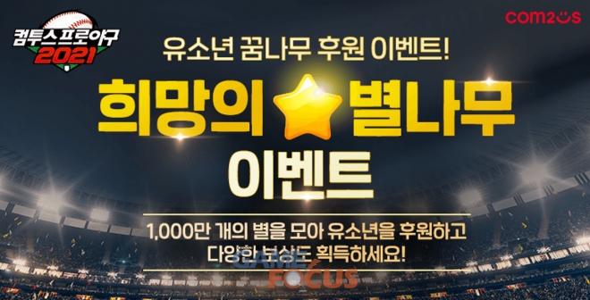 오는 19일까지 약 3주간 진행되는 '희망의 별나무 이벤트'는 '컴프야2021'을 플레이 하는 유저라면 누구나 간단한 게임 플레이를 통해 참여가 가능하다. 유저들은 이벤트 기간 동안 매일 게임 내 주어지는 미션 달성 시 일정 개수의 별을 별나무에 적립할 수 있으며, 모든 참여자의 별의 개수가 1,000만 개를 달성할 경우 야구 꿈나무들을 위한 후원금이 전달된다.