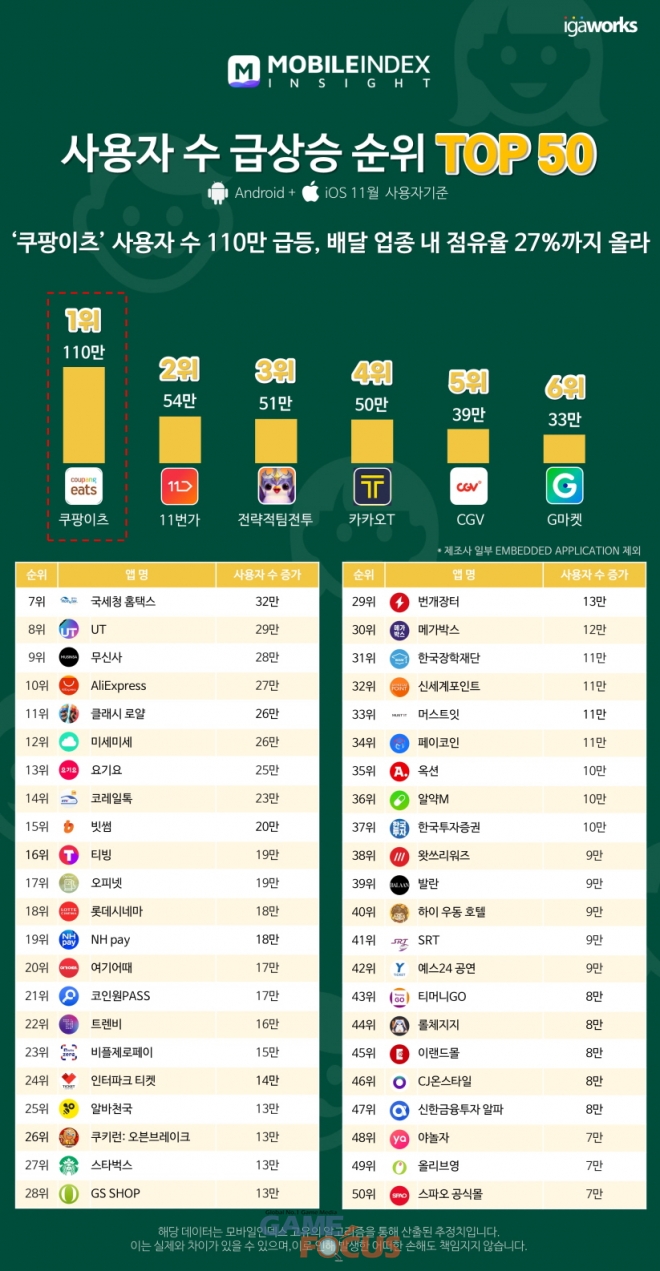 아이지에이웍스가 모바일인덱스 '11월 MI TOP 50' 리포트를 발표했다.