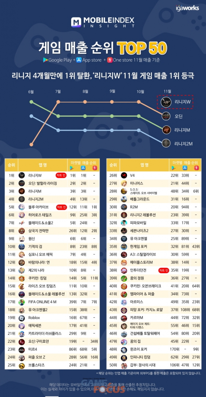 11월 게임 매출 순위에서는 '리니지W'가 구글플레이, 애플 앱스토어, 원스토어 합산 게임 매출 순위 1위를 기록했고, '오딘: 발할라 라이징'은 4개월만에 2위로 밀려났다.
