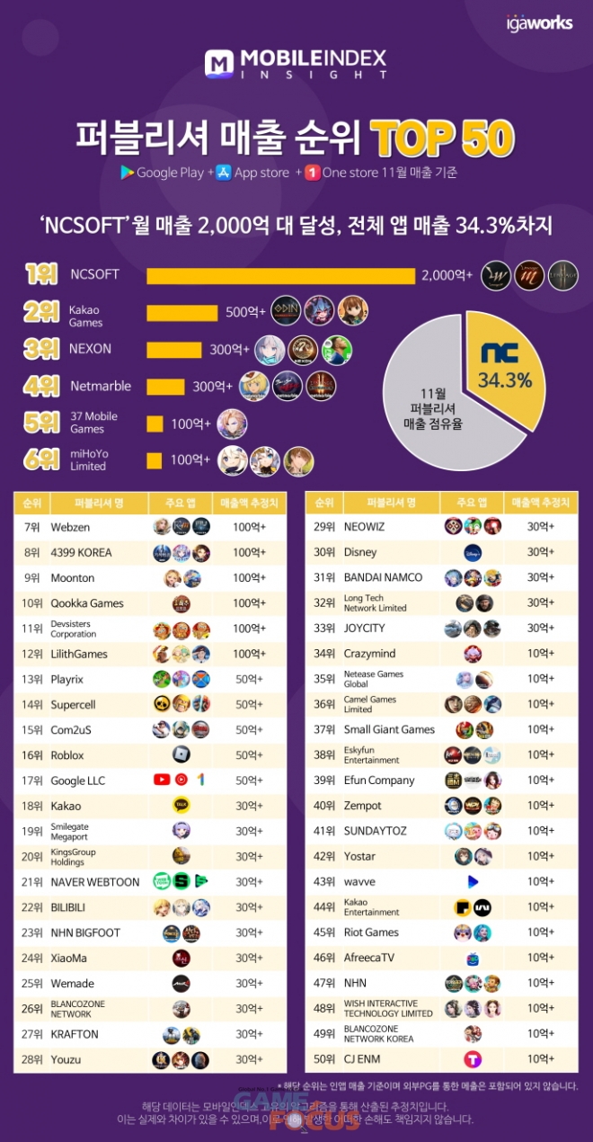 또한, 월 매출이 2000억대에 도달하며 11월 퍼블리셔 매출 순위 1위에 오른 'NCSOFT'는 11월 전체 앱 매출의 34.3%를 점유하고 있는 것으로 나타나 눈길을 끈다.