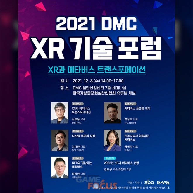 12월 8일 열리는 이날 포럼은 주요 XR 기술과 적용 사례, 국내외 XR 관련 핵심 이슈 등에 대해 전문가를 초청해 이야기하는 특별 포럼이다. 'XR과 메타버스 트랜스포메이션'을 주제로 미래 경제 시스템이 메타버스로 이동하는 시점에 XR 산업과 메타버스 주요 동향, 플랫폼 시장·디지털 휴먼·AI(인공지능)·NFT(대체 불가능 토큰) 등에 관해 논의할 예정이다.
