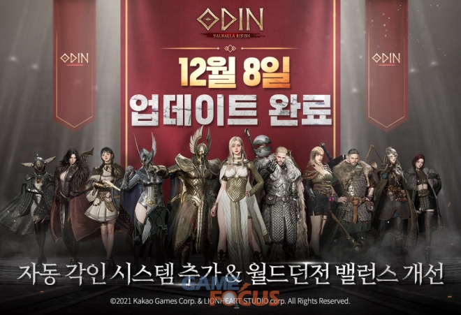 (주)카카오게임즈(각자 대표 남궁훈, 조계현)가 8일, 개발 명가 라이온하트 스튜디오(대표 김재영)의 대작 MMORPG '오딘: 발할라 라이징(이하 '오딘')'에 자동 각인 시스템 추가를 비롯해 다양한 시스템 편의성 개선을 진행했다.