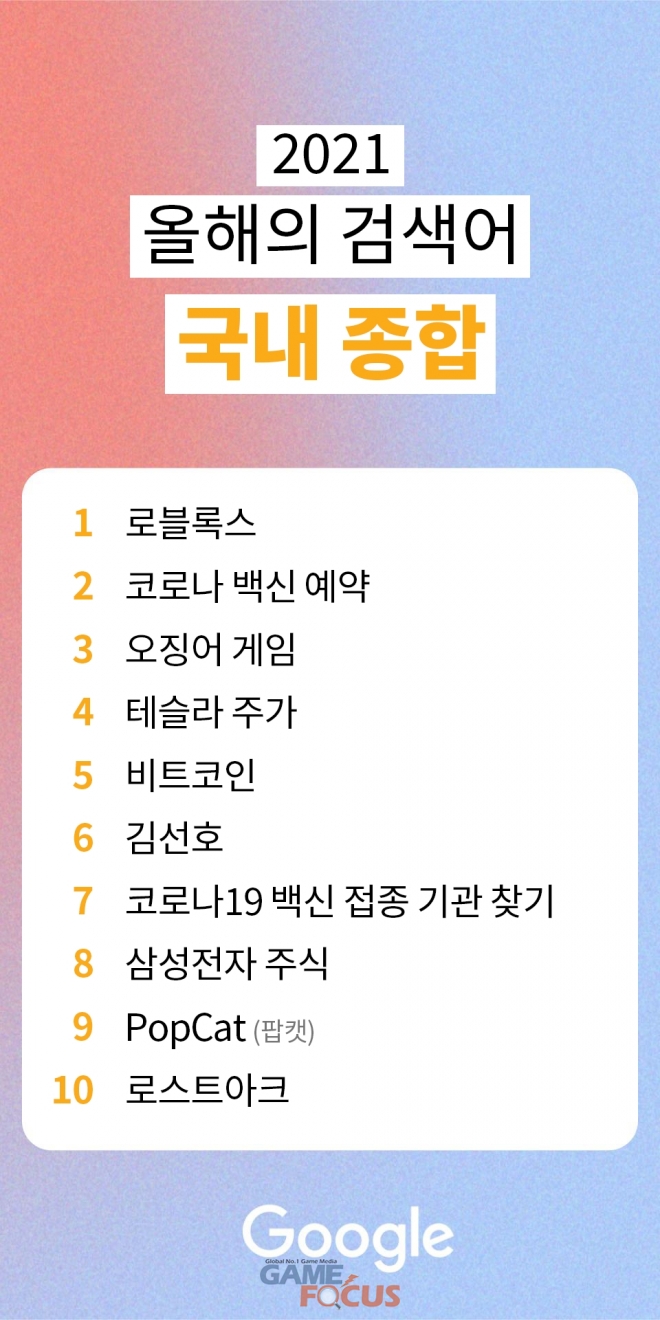 2021년 국내 검색어 종합 순위는 1) 로블록스 2) 코로나 백신 예약 3) 오징어 게임 4) 테슬라 주가 5) 비트코인 6) 김선호 7) 코로나19 백신 접종 기관 찾기 8) 삼성전자 주식 9) PopCat(팝캣) 10) 로스트아크 순으로 나타났다.