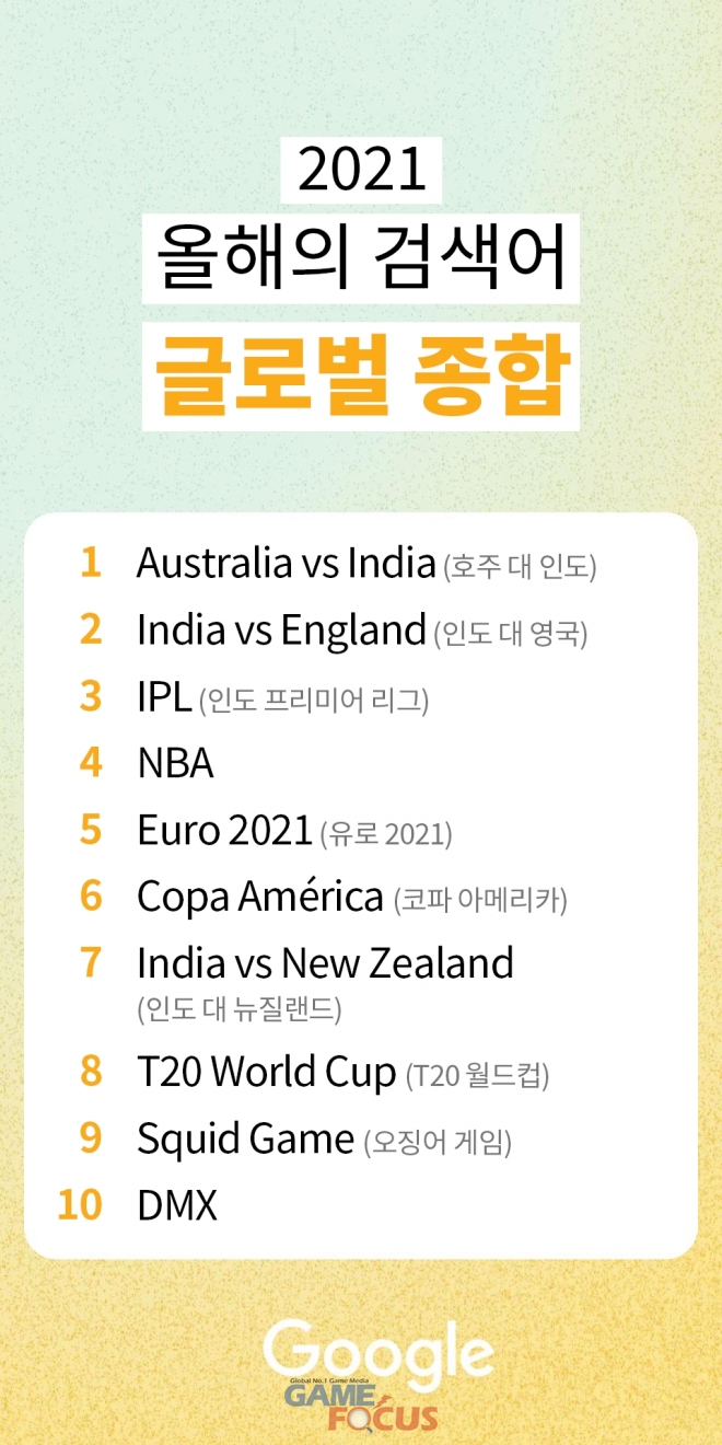 한편, 글로벌 종합 검색어 순위는 1) 호주 대 인도 2) 인도 대 영국 3) 인도 프리미어 리그 4) NBA 5) 유로 2021 6) 코파 아메리카 7) 인도 대 뉴질랜드 8) T20 월드컵 9) 오징어 게임 10) DMX 순으로 나타났다.
