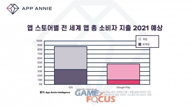 소비자 지출을 주도한 분야는 여전히 모바일 게임이 압도적이었다. 앱애니의 분석에 따르면 iOS 매출의 60%, 구글 플레이 매출의 80%가 게임 영역에서 발생했다. 이는 약 900억 달러(한화 약 106조 원)에 달하는 수치로, 모바일 게임 매출 1,000억 달러 시대가 언제 열릴 것인지에 대한 관심 역시 높아지고 있다.