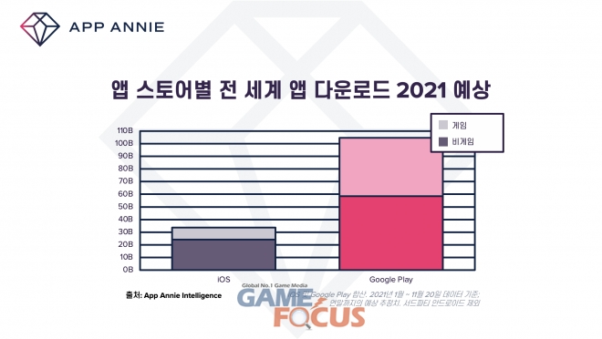 소비자 지출액은 iOS, 그리고 다운로드에서는 구글 플레이가 강세를 각각 나타냈다. 올해 전 세계 소비자 지출액의 약 65%는 iOS에서 발생할 것으로 전망되며, 올 한해 전체 1,400억 건의 다운로드 중 1,000억 건 이상이 구글 플레이에서 일어날 것으로 예상된다.