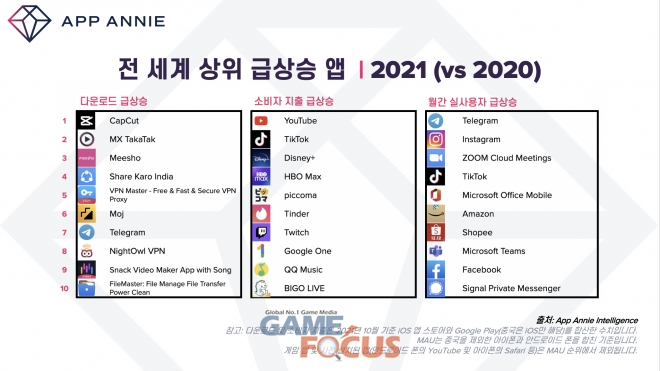 2021년 비게임 부문 가장 큰 성장을 이루어낸 분야는 엔터테인먼트 및 소셜 앱이었다. 특히 앱애니는 '틱톡'이 '유튜브'에 이어 전 세계 상위 급상승 앱 소비자 지출 부문 2위를 차지하고, 틱톡 영상 편집 앱인 '캡컷'이 다운로드 부문에서 1위를 차지한 점에 주목했다. 이 밖에도 'MX TakaTak,' 'Moj'와 같은 영상 편집 앱이 연달아 다운로드 상위차트를 석권하며 일명 '틱톡 효과'를 통해 전 세계 소비자들은 전년 대비 각자만의 콘텐츠 제작과 공유에 더 많은 관심을 기울인 점이 여실 없이 드러났다. 소비자 지출 부문은 '유튜브,' '디즈니+,' '트위치'와 같은 라이브와 콘텐츠 스트리밍 앱들이 석권하며, 올 한해 전 세계 소비자들은 4G와 5G의 영향으로 언제 어디서든 스트리밍 콘텐츠를 즐기며 금전적 소비를 한 것으로 나타났다(모두 2020년 1-10월, 2021년 1-10월 비교 기준).