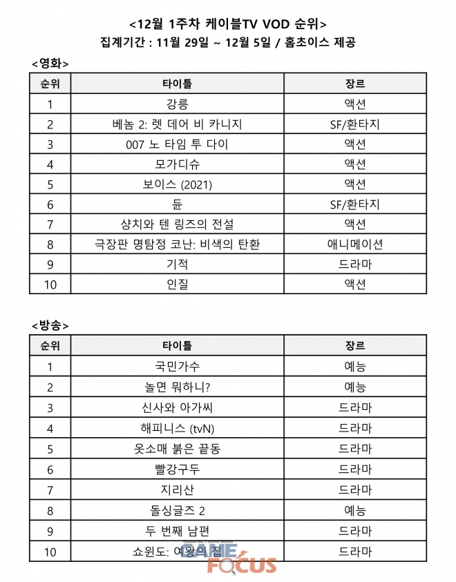 9일 (주)홈초이스가 발표한 LG헬로비전, Btv 케이블, 딜라이브, CMB, HCN 등 전국 케이블TV '12월 1주차 영화 · 방송 VOD 순위'에 따르면, '강릉'이 영화 VOD 판매 순위 1위에 새롭게 등장했다.