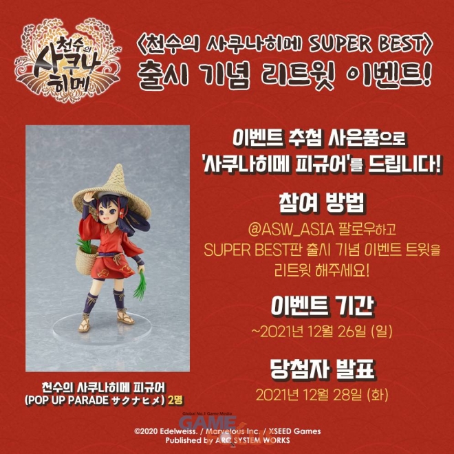 아크시스템웍스 아시아지점은 '천수의 사쿠나히메 SUPER BEST'의 출시를 기념하여, 추첨을 통해 '천수의 사쿠나히메 피규어’를 증정하는 리트윗 이벤트를 오늘부터 개최한다.
