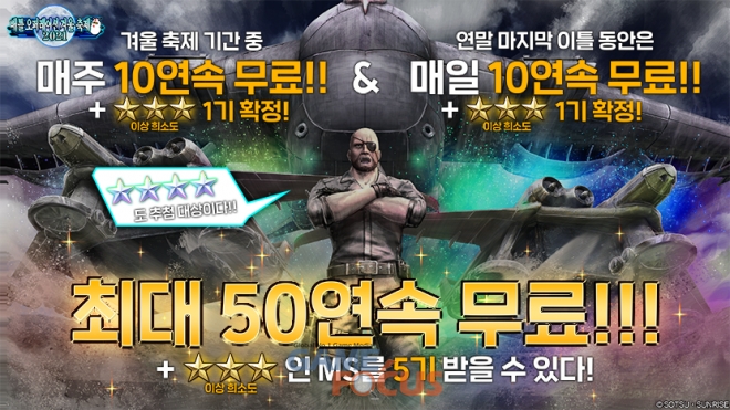 ★★★★까지 포함해 ★★★ 이상 희소도의 MS가 1기 확정인 무료 추첨 배급 최대 50연속 제공