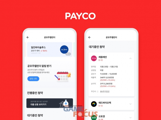 이용자는 ‘페이코 공모주 캘린더’를 통해 청약 예정, 진행, 종료 등 청약 진행 상태에 따라 해당 종목들을 한 곳에서 모아 볼 수 있다. 종목별 청약일과 상장일, 공모가, 상장 주간사, 매출, 순이익 등 세부 정보도 손쉽게 확인 가능하다. 알림 신청 시에는 청약 시작일과 상장 당일 알림 서비스를 제공하며, 서비스 내에서 주간 증권사 계좌 개설 페이지로 연결을 지원해 투자 편의성을 제고한 것도 특징이다. ‘페이코 공모주 캘린더’ 서비스는 페이코 앱 내 금융 탭에서 이용할 수 있다.