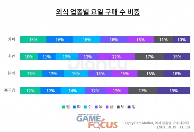 지난 10~11월 외식 품목 별 구매 데이터를 분석한 결과, 구매가 많은 상위 4개 외식 업종은 카페, 치킨, 분식, 중식이었다. 카페 업종은 주말보다 평일 구매가 많았으며, 요일 별 구매 비중은 평일 5일 모두 15~16%의 수준의 비중으로 비슷하게 구매가 발생했다. 반면 치킨은 금요일 구매 비중이 22%로 일주일 중 가장 높았고, 분식과 중식 업종은 일요일에 가장 많은 판매를 기록했다.
