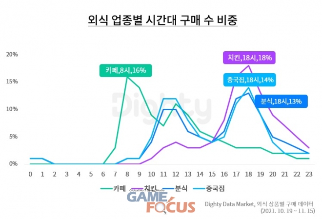 카페 메뉴는 점심시간이나 오후보다 오전에 더 많이 소비되는 것으로 나타났다. 카페 업종은 오전 8시 구매 비중이 가장 높았으며, 오전 8~9시에는 하루 구매의 30%가 발생했다. 치킨, 분식, 중식은 하루 중 오후 6시에 가장 활발히 구매가 발생해, 점심보다 저녁 식사 때 선호되는 것으로 확인됐다.