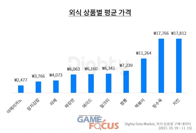 주요 외식 품목 별 평균 가격은 치킨이 1만 7,812원으로 가장 비쌌다. 이어 탕수육 1만 7,766원, 떡볶이 1만 1,264원, 짬뽕 7,239원, 밀크티 6,341원 순으로 집계됐다.