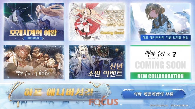 또한 하프 애니버서리 업데이트에서는 드디어 많은 유저들이 기대하고 있는 북방의 여왕 '베들레헴' 오로리안이 등장하며, 불 속성 6성 캐릭터 '노비오', 숲 속성 5성 '로라' 등이 추가된다.