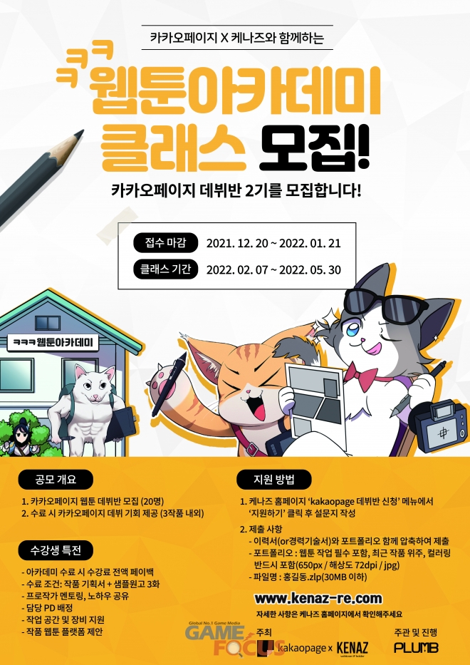 모집 일정은 20일부터 내년 1월 21까지 서류 전형, 1월 24일부터 27일까지 면접 전형을 거쳐 1월 28일 합격자 발표 후 2월 7일에 개강한다. 아카데미에 지원하려면 이력서 또는 경력기술서, 웹툰 작업본이 담긴 포트폴리오 제출이 필수 요건이다. 신청은 케나즈 홈페이지(https://kenaz-re.com/kakaoseason2)를 통해 가능하다.