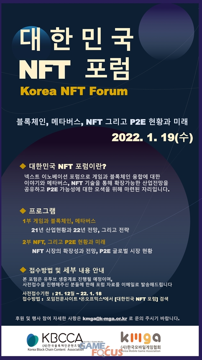 한국모바일게임협회(회장 황성익)가 메타버스, 블록체인 등 대한민국 게임산업의 미래 신사업을 확인하는 포럼 '대한민국 NFT 포럼'을 2022년 1월 19일 개최한다.