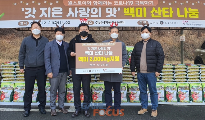 원스토어는 지난 21일 성남시 자원봉사센터와 '원스토어와 함께하는 행복의 쌀 나눔' 행사를 갖고 취약 계층에게 10kg 쌀 포대 200개를 전달했다. 원스토어는 쌀 2,000kg의 구매 비용을 매년 진행하던 연말 송년회를 취소하고 여기에 소정의 추가 기부금을 더해 마련했다.