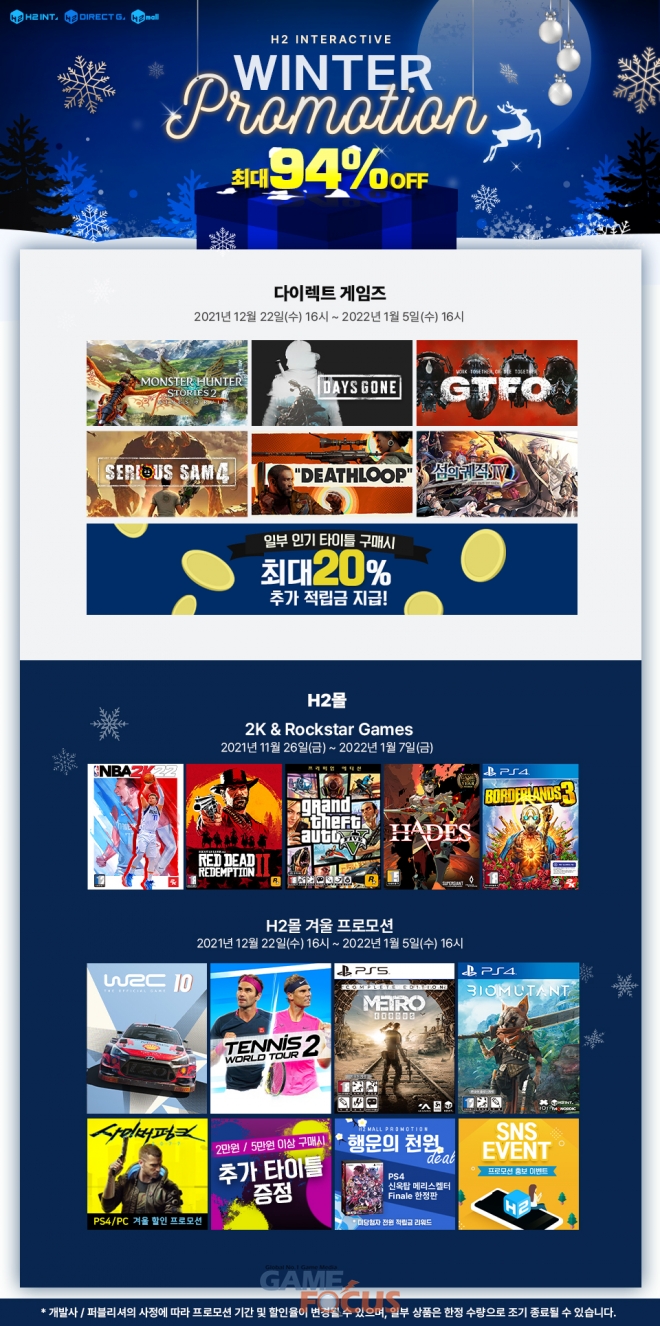 (주)에이치투 인터렉티브(이하 H2 INTERACTIVE, 대표 허준하)는 디지털 유통 서비스인 다이렉트 게임즈와 패키지 쇼핑몰인 H2몰에서 12월 22일부터 겨울 할인 프로모션을 비롯한 다양한 이벤트를 진행한다고 밝혔다.