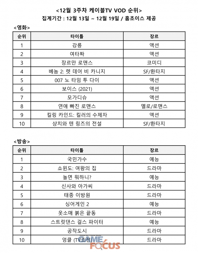 23일 (주)홈초이스가 발표한 LG헬로비전, Btv 케이블, 딜라이브, CMB, HCN 등 전국 케이블TV '12월 3주차 영화 · 방송 VOD 순위'에 따르면, '강릉'이 2주만에 영화 VOD 판매 순위 1위를 탈환했다.