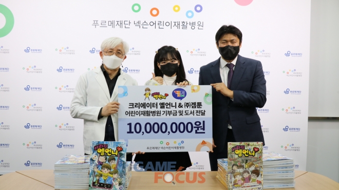 겜툰(대표 송경민)과 크리에이터 '옐언니'가 12월 23일 '사라진 옐언니' 10권 완간을 기념해 수익금 일부인 1천만 원을 '푸르메재단 넥슨어린이재활병원'에 기부했다. 이와 함께 크리에이터 옐언니는 비대면으로 사인회를 진행하고 어린이 30여 명에게 친필 사인이 들어간 '사라진 옐언니' 책도 선물했다.
