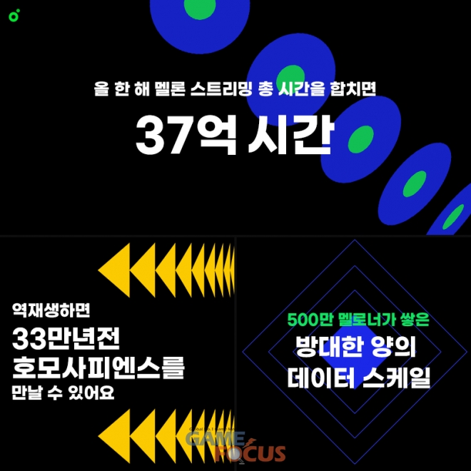올 한 해 멜론 내에서 재생한 곡의 완곡 시간을 모두 합하면 총 37억시간에 달한다. 이를 현재부터 역재생하면 약 33만년전으로 현대인의 직계 조상으로 알려진 ‘호모 사피엔스(Homo sapiens)’ 가 활동했던 시절까지 거슬러 올라간다.