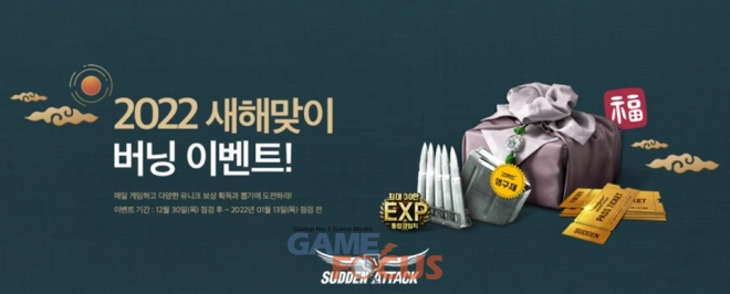 이 밖에 1월 13일까지 새해맞이 이벤트를 실시한다. 이 기간 특정 미션을 완료하면 반투명, 도깨비, 트리 등 인기 스킨 무기를 최대 100일까지 획득할 수 있는 뽑기 기회를 제공한다. 뽑기 기회를 30회 획득할 시에는 '영구제 탄창(2개)', '패스 티켓(20개)', 통합 경험치 30만을 추가 지급한다.