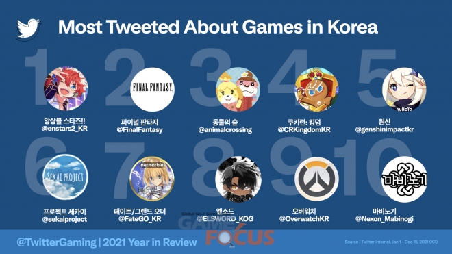 '2021 국내에서 가장 많이 언급된 게임' 1위에는 해피 엘리먼츠의 모바일 아이돌 육성 시뮬레이션 게임인 '앙상블 스타즈!!(Ensemble Stars, @enstars2_KR)'가 올랐다. 앙상블 스타즈!!는 트위터 공식 계정에서 게임 속 유닛의 뮤직비디오 시리즈를 공개하며 많은 관심을 모으고 있으며, 지속적으로 이벤트를 열고 광고 캠페인을 활발하게 진행하는 등 이용자들과 활발하게 소통을 이어가고 있다. 2위는 액토즈소프트가 서비스 중인 PC MMORPG '파이널 판타지(Final Fantasy, @FinalFantasy)'였으며, 2021년 상반기 집계에서 4위를 차지했던 닌텐도의 '동물의 숲(Animal Crossing, @animalcrossing)'은 이번 발표에서 3위로 집계됐다.