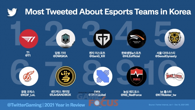 트위터를 통해 글로벌 팬과 활발히 소통하고 있는 국내 e스포츠팀 순위도 공개됐다. '2021 국내에서 가장 많이 언급된 e스포츠팀' 1위는 SK 텔레콤의 e스포츠팀 'T1(@T1)'이 차지했다. 페이커 (이상혁 , @faker) 선수가 소속되어 있는 T1은 국내 e스포츠팀 중 유일하게 '2021 전 세계에서 가장 많이 언급된 e스포츠팀' 9위에 이름을 올리며 전 세계적인 인기를 입증했다. 이어 지난해 'LoL 챔피언스 코리아(이하 LCK)'를 제패한 '담원 기아(@DWGKIA)'와 2022 LCK 스프링 시즌의 강력한 우승후보로 꼽히는 '젠지 이스포츠(@GenG_KR)'가 각각 2위와 3위로 집계됐다. '한화생명e스포츠(@HLEofficial)', 서울 다이너스티(@SeoulDynasty)', '광동 프릭스 (@KDF_LoL)', '샌드박스 게이밍 (@LiivSANDBOX)', 'DRX (@DRXGlobal)', '농심 레드포스 (@NS_RedForce)', 'KT 롤스터(@KTRolster_tw)'등도 TOP10으로 확인됐다. 2022 LoL 챔피언스 코리아 스프링 시즌은 1월 12일 개막해 3월 20일까지 진행된다.