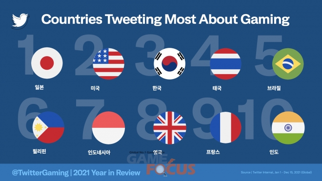 이번 발표에는 글로벌 순위도 함께 공개됐다. 한국은 '2021 게임 관련 트윗을 가장 많이 한 국가' 순위에서 3위를 차지했다. 일본이 1위, 미국이 2위로 확인됐으며 태국과 브라질, 필리핀, 인도네시아 영국, 프랑스, 인도가 그 뒤를 이었다.