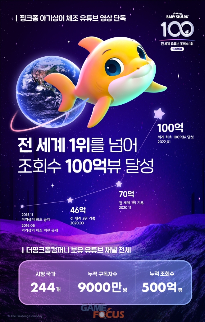 '핑크퐁 아기상어 체조'는 '핑크퐁 아기상어'에 율동이 가미된 버전으로 2016년 6월 처음 공개됐으며, 2020년 11월 푸에르토리코 출신 가수 루이스 폰시의 '데스파시토'를 제치고 전 세계 유튜브 조회수 1위로 기네스북에 등재됐다. 이후 15개월 연속 유튜브 정상을 차지하다가, 13일 오후 4시경 누적 조회수 100억뷰를 돌파하며 막강한 글로벌 영향력을 다시 입증했다.