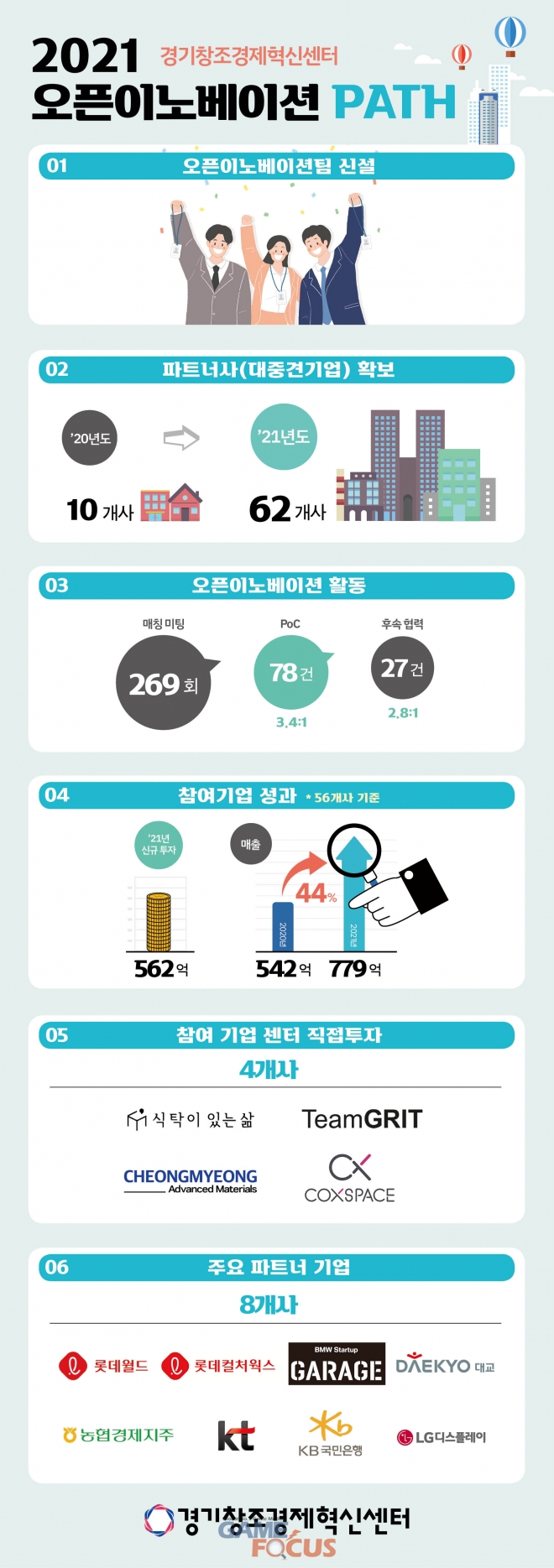 경기혁신센터는 17일 공식 홈페이지를 통해 지난 1년간의 오픈이노베이션 성과 및 확장을 알리는 인포그래픽 ‘2021 경기창조경제혁신센터 오픈 이노베이션 패스(Path)’를 공개했다(‘21년 12월 기준 실적).
